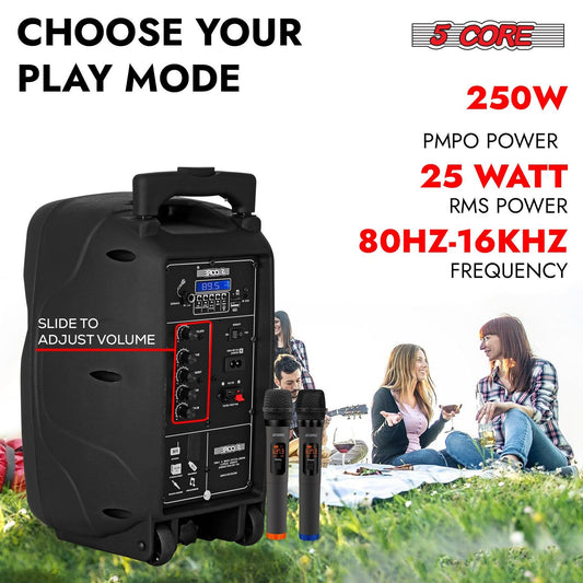 5 Core Party Speaker Bluetooth 250W Big Monster Powered Rechargeable Outdoor PA DJ System w Disco Lights 2 Wireless Karaoke Mics Portable Rolling Speakers w Handle Black - ACTIVE HOME 8 2-MIC
